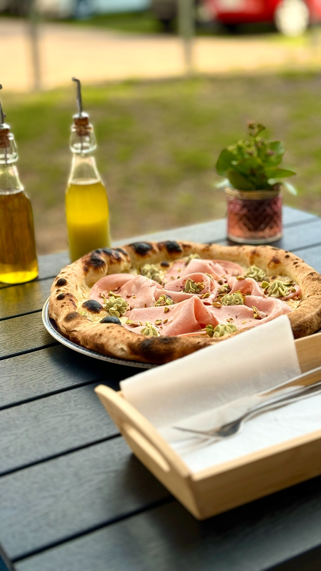 sos pomidorowy, mozzarella, nduja vegańska, papryka grillowana, mascarpone, pesto z rukoli -